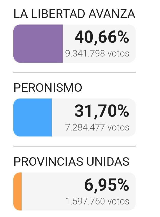 En la sumatoria de votos de los 24 distritos, este domingo se impuso La Libertad Avanza con 40,72% de los votos, por sobre 31,67% de Fuerza Patria y aliados. La diferencia es de casi 2 millones de votos, ya que el oficialismo sumó 9.314.147 votos, mientras que el peronismo sólo 7.245.834.